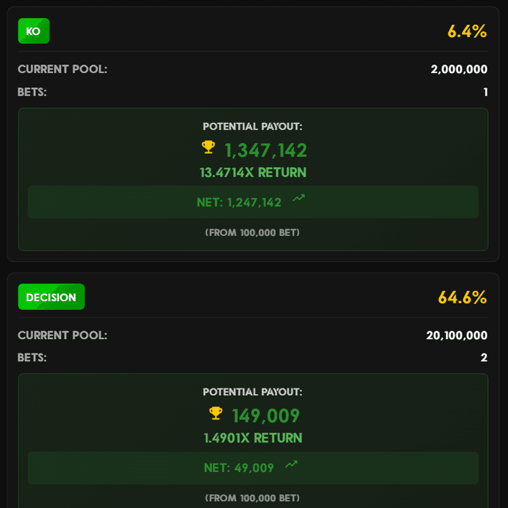 Each match has 3 conditions you can bet on. Bet on your favourite fighter and be in with the chance to win big.